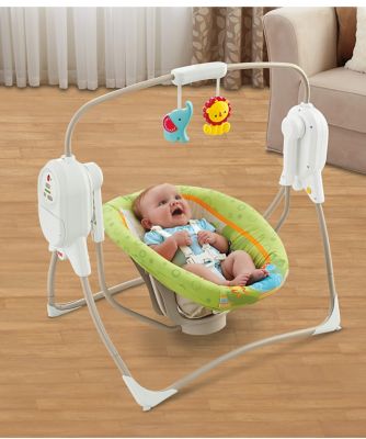 Travel swing fisher. Fisher Price Space Saver Seat 'n Swing - Rainforest soothing comfort--all Fisher-Price Deluxe Rainforest Friends Cradle 'n Swing cradles and globe for self-discovery, and linkable frog toy that detaches for take-along. ... Read Content